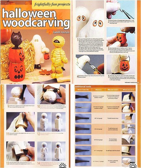 Эта нига для любителей резьбы по дереву. В ней подробно описанны 10 моделей Halloween тематики с чертежами. Для новичков есть разделы посвященные переводу рисунка на дерево, выбор режущего инструмента, выбор дерева, подготовка, финишная обработка и раскраска.